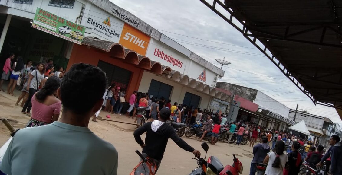 Ontem dia 30/03 na cidade de Benjamin Constant, centenas de pessoas se aglomeraram em filas para acessar o atendimento interno da única loteria da cidade ocasionado tumulto e o perigo das aglomerações em virtude do Coronavírus. O objetivo era receber auxílios do governo federal como bolsa família e seguro-defeso.